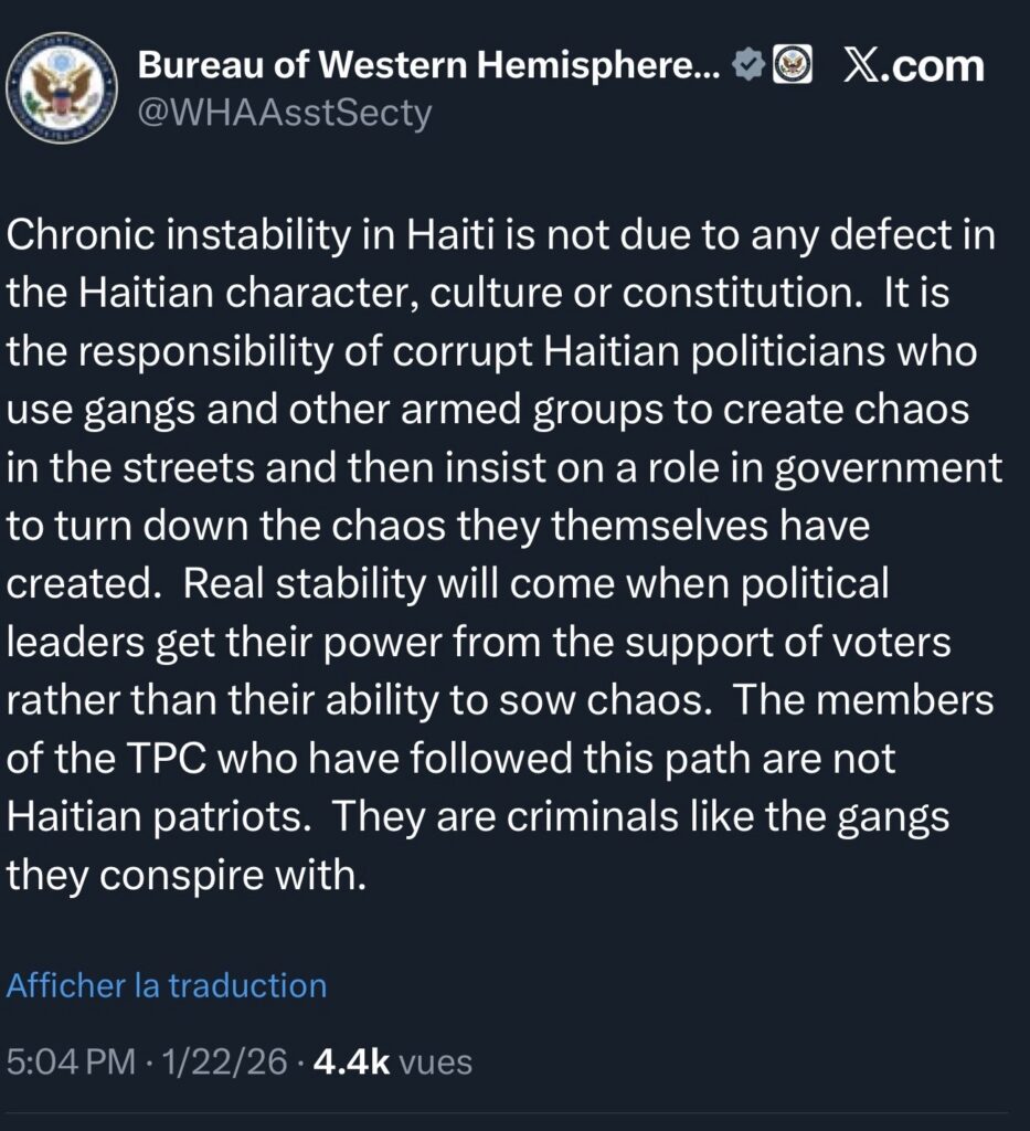 Un message publié ce 22 janvier 2026 par le Bureau des affaires de l’hémisphère occidental du Département d’État américain marque une rupture de ton rarement observée dans la communication officielle de Washington sur la crise haïtienne. Dans ce tweet, l’administration américaine ne se contente plus d’évoquer l’instabilité, l’insécurité ou la nécessité de réformes : elle désigne explicitement des responsables, accuse, et trace une ligne politique claire entre légitimité démocratique et usage du chaos comme instrument de pouvoir.